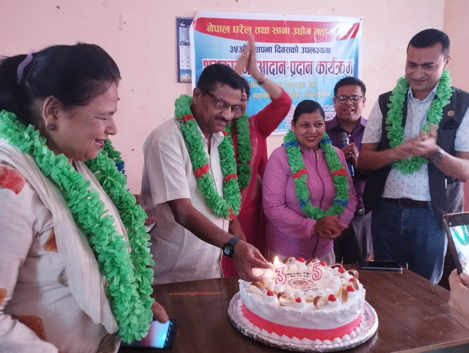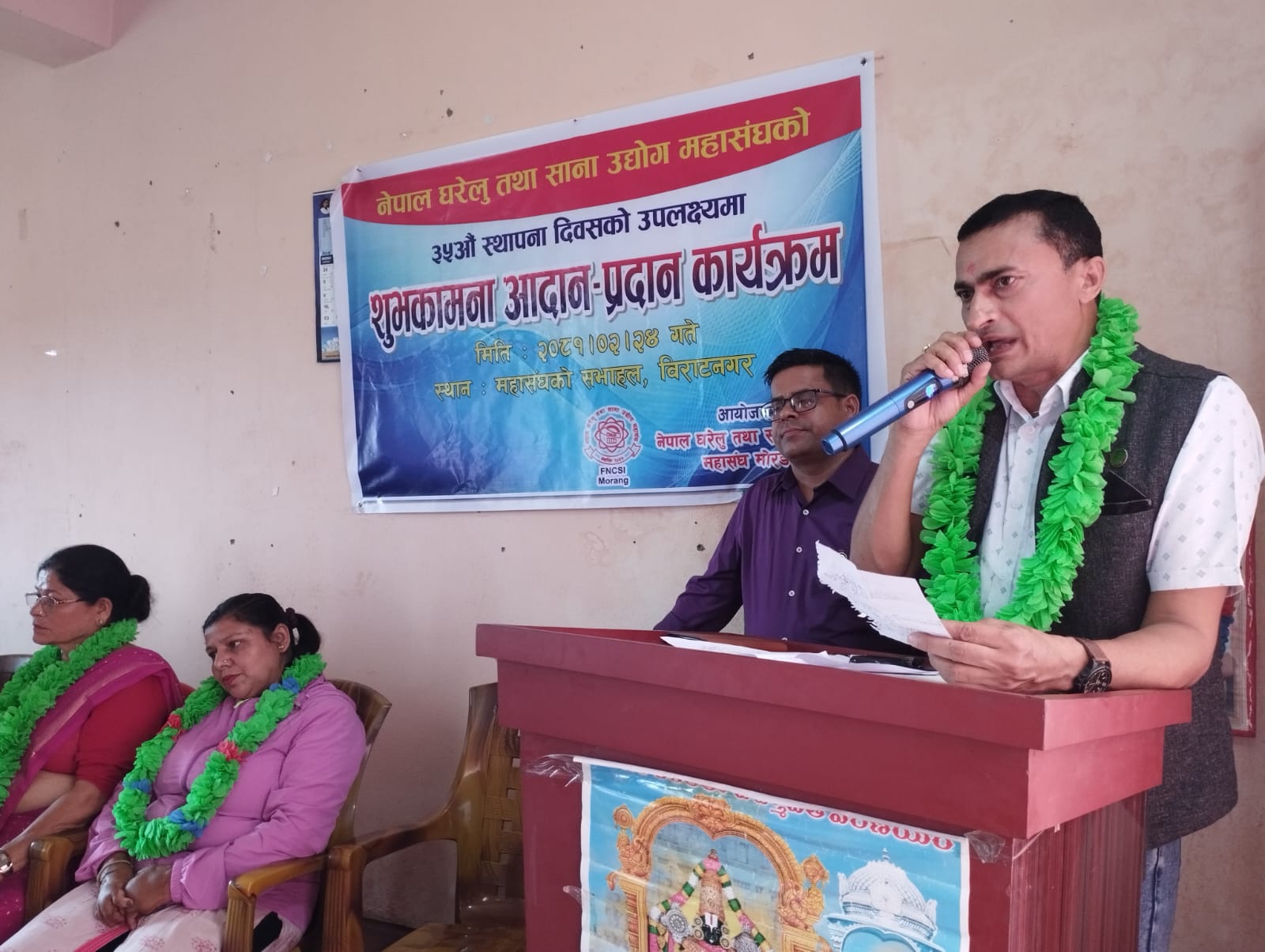 विराटनगर : नेपाल घरेलु तथा साना उद्योग महासंघले आफ्नो ३५औं स्थापना दिवस मनाएको छ । बिहीबार विराटनगर-५ सभाहलमा कार्यक्रमको आयोजना महासंघको मोरङ शाखाले स्थापना दिवसको अवसरमा शुभकामना आदानप्रदान गरि मनाएको हो ।