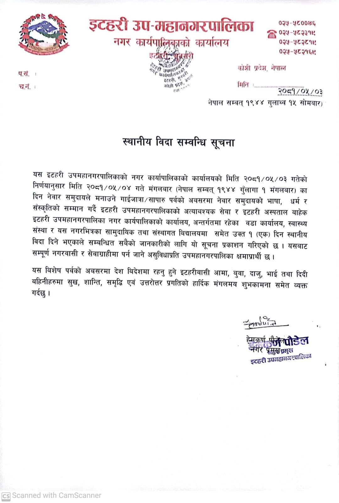 इटहरी । इटहरी उपमहानगरपालिकाले मंगलबार (आज) सार्वजनिक बिदा दिने निर्णय गरेको छ । गाईजात्राको अवसरमा उपमहानगरपालिकाले आज पालिकाभित्र सार्वजनिक बिदा दिने निर्णय गरेको हो ।