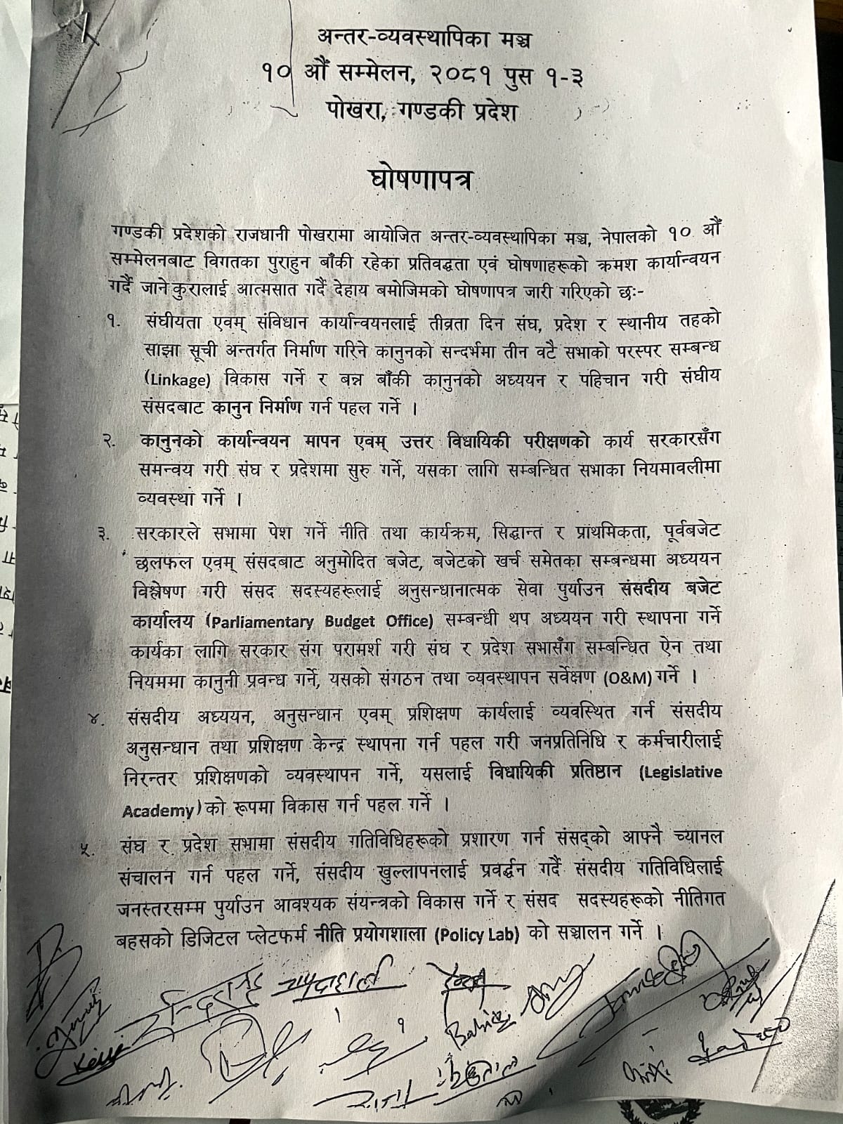 गण्डकी प्रदेशको राजधानी पोखरामा पुस १ देखि ३ गतेसम्म भएको प्रदेश र प्रतिनिधिसभाका सभामुख र उपसभामुख तथा राष्ट्रियसभाका अध्यक्ष र उपाध्यक्षहरूको सम्मेलनले उक्त घोषणापत्र सार्वजनिक गरेको थियो ।