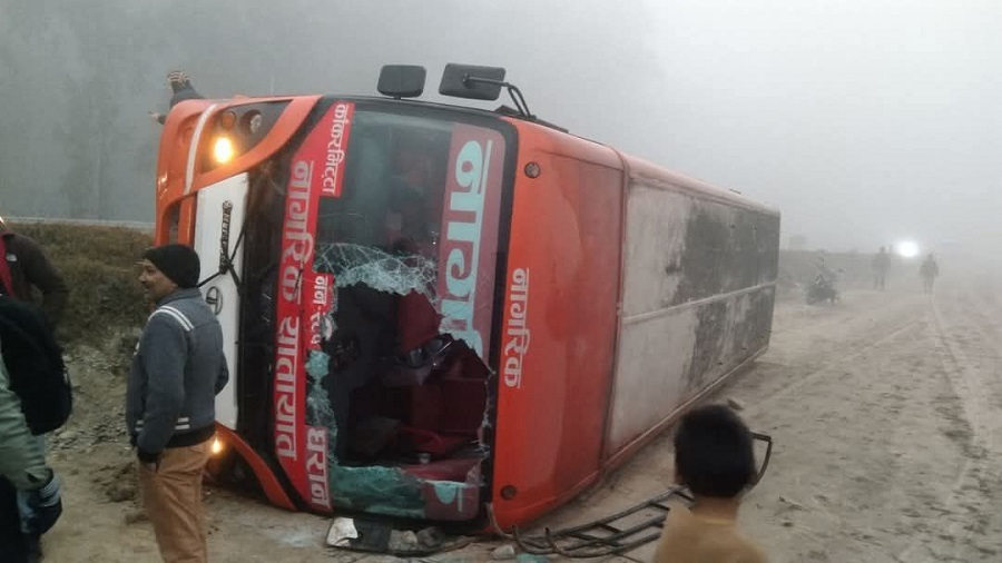 नागरिक यातायातको यात्रुवाहक बस अनियन्त्रित भई बस सडकबाट तल खसेर पल्टिएको थियो ।