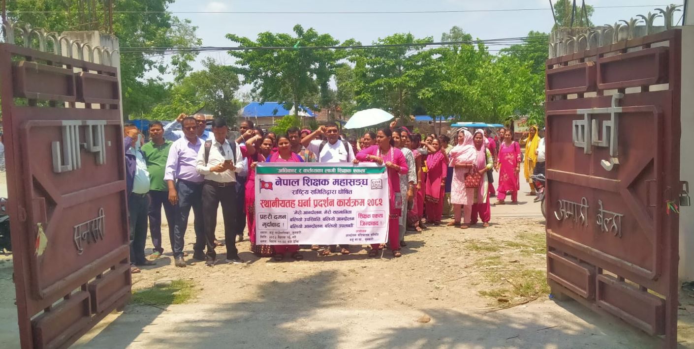इसिडी र विद्यालय कर्मचारीबाहेक तीन सयको हाराहारीमा रहेका शिक्षकहरू गर्मी र घामको राप नभनी धर्नामा बसेका छन् ।