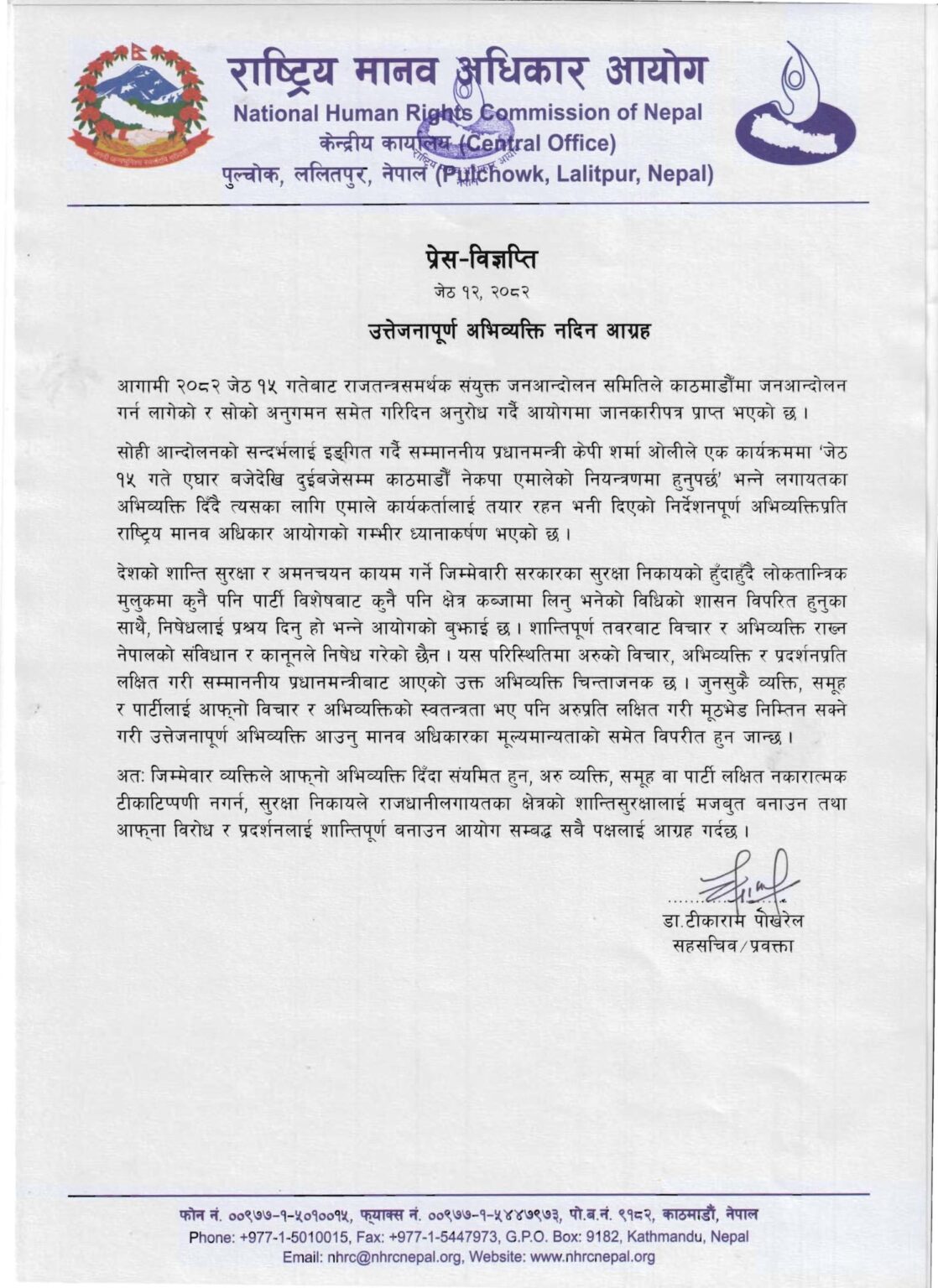 आगामी २०८२ जेठ १५ गतेबाट राजतन्त्रसमर्थक संयुक्त जनआन्दोलन समितिले काठमाडौँमा जनआन्दोलन गर्न लागेको र सोको अनुगमन गरिदिनसमेत आयाेगमा जानकारीपत्र प्राप्त भएको आयाेगले जनाएकाे छ ।