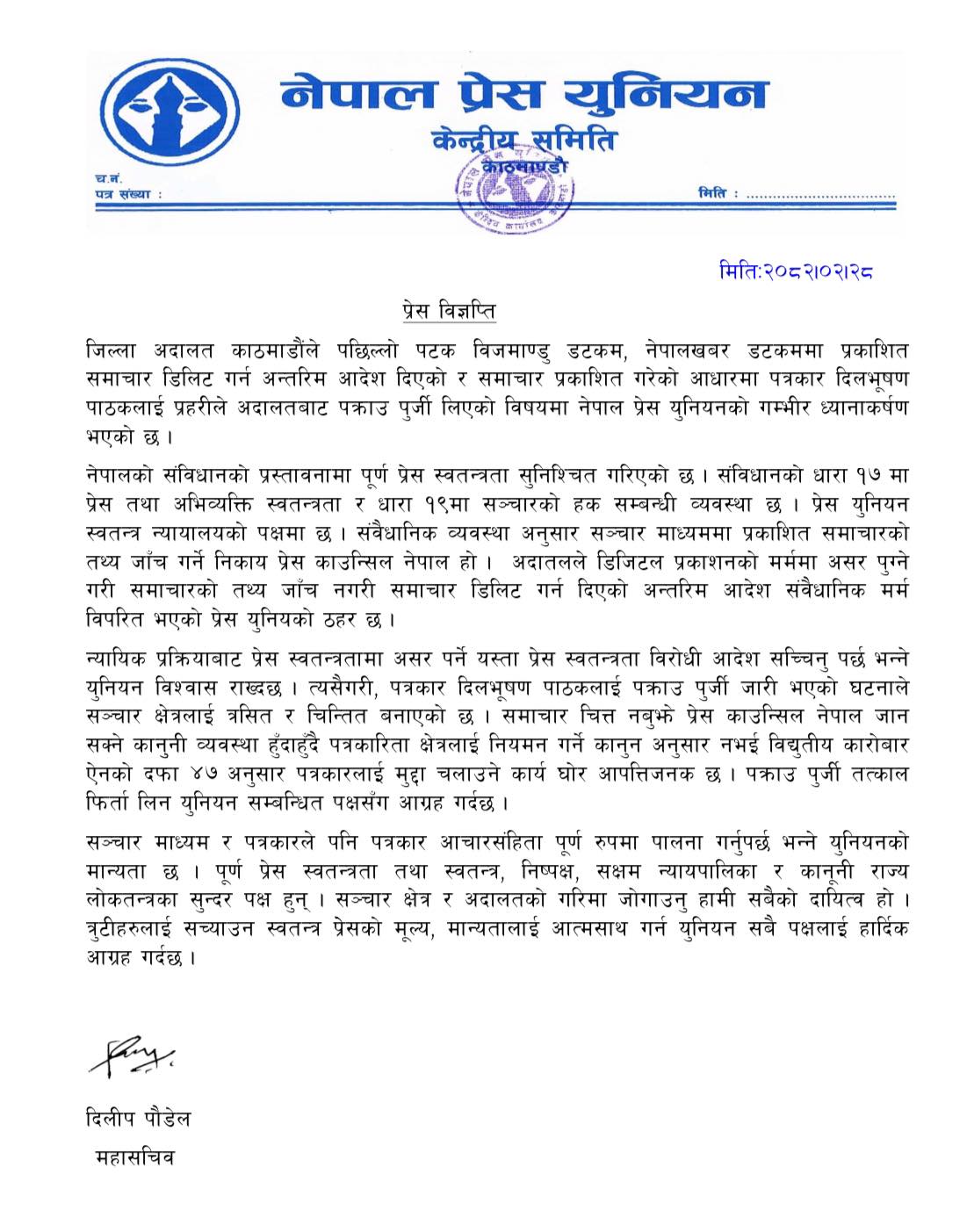 नेपाल प्रेस युनियनले डिजिटल प्रकाशनको मर्ममा असर पुग्ने गरी समाचारको तथ्य जाँच नगरेर समाचार ‘डिलिट’ (मेटाउन) जिल्ला अदालतले दिएको अन्तरिम आदेश संवैधानिक मर्मविपरीत भएको बताएको छ ।
