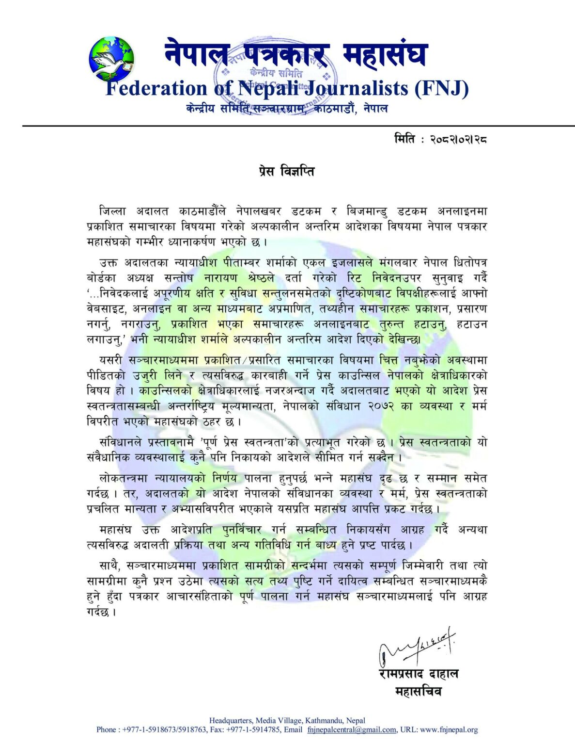 नेपाल पत्रकार महासंघले जिल्ला अदालत काठमाडौंको आदेश संविधानको व्यवस्था, मर्म, प्रेस स्वतन्त्रताको प्रचलित मान्यता र अभ्यासविपरीत भएकाको भन्दै आपत्ति जनाएको छ ।