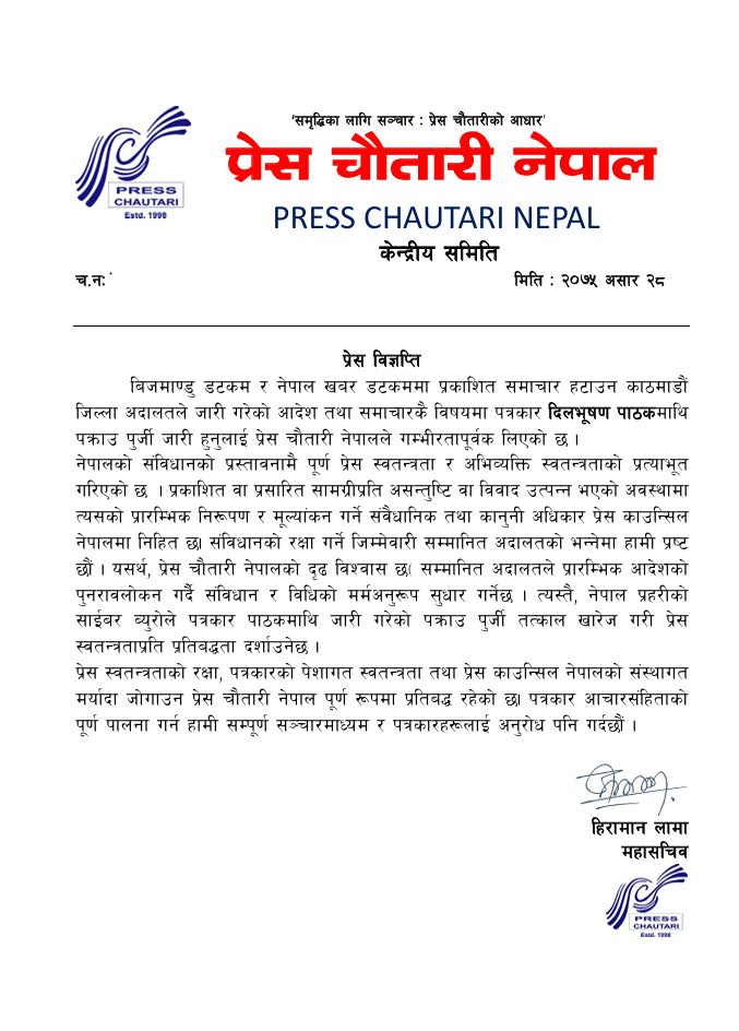 प्रेस चौतारी नेपालले समाचार हटाउन र पत्रकार दिलभूषण पाठकविरुद्ध पक्राउ पुर्जी जारी गरिएको विषयलाई गम्भीरतापूर्वक लिएको जनाएको छ ।