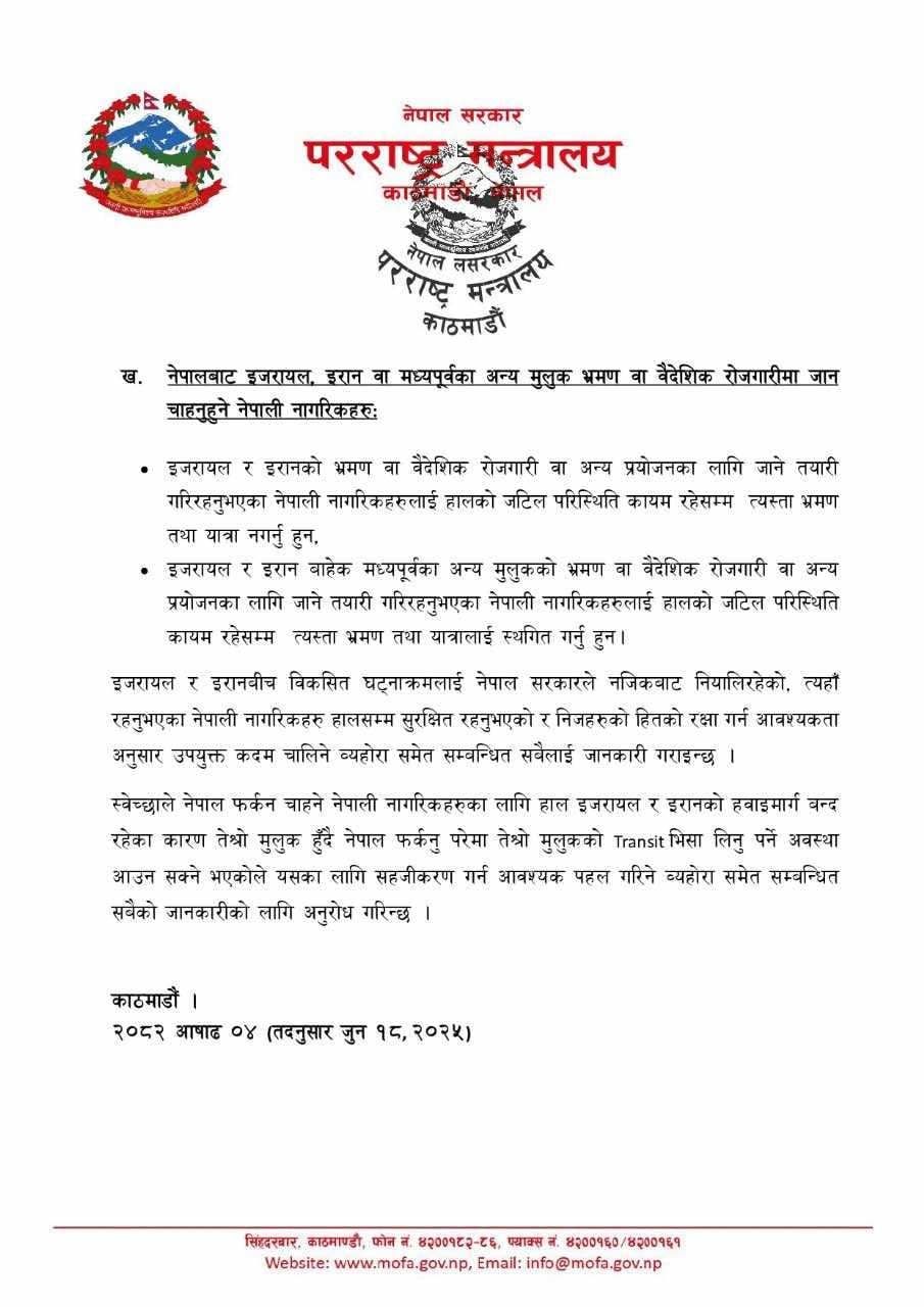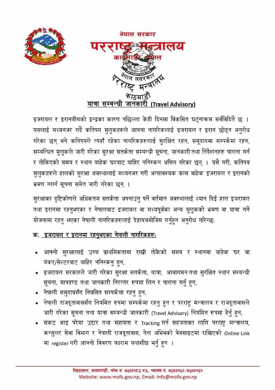 मन्त्रालयले यसबाहेक इजरायल तथा इरान जाने तयारीमा रहेका नेपाली नागरिकहरूले हालको अवस्था ध्यानमा राखेर यात्रा योजनालाई पुनरावलोकन गर्न सुझाव दिएको छ।