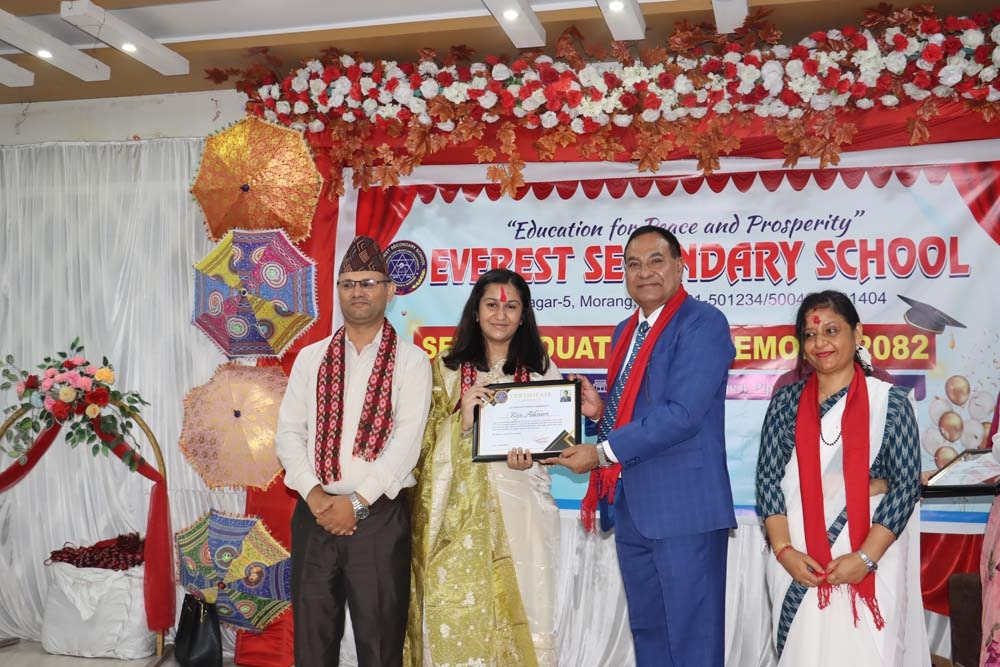 विराटनगर । विराटनगरको एभरेष्ट बोर्डिङ स्कुलले यस वर्षको माध्यमिक शिक्षा परीक्षा (एसइई) मा उत्तीर्ण हुने १७१ जना विद्यार्थी र उनीहरूका अभिभावकहरूलाई अभिनन्दन गरेको छ ।