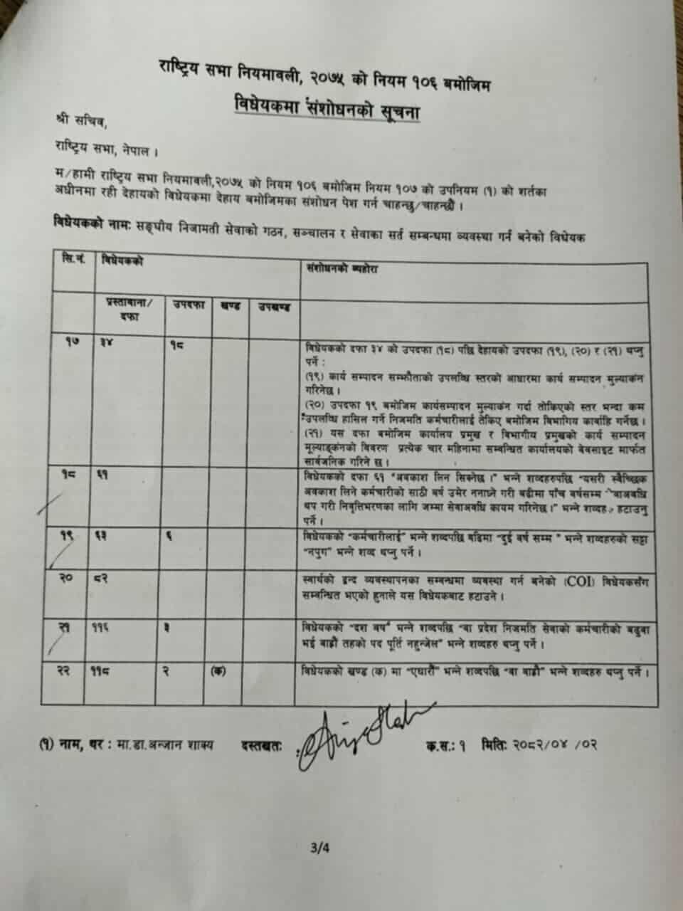 प्रतिनिधिसभाले सरकारी कर्मचारीका लागि २ वर्ष ‘कुलिङ अफ पिरियड’ को प्रावधानसहित विधेयक पारित गरेर राष्ट्रियसभामा पठाएको छ । सोही विधेयक अहिले राष्ट्रियसभामा पनि छलफलका क्रममा छ ।