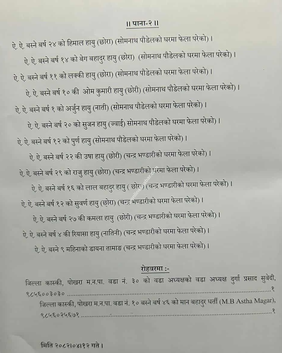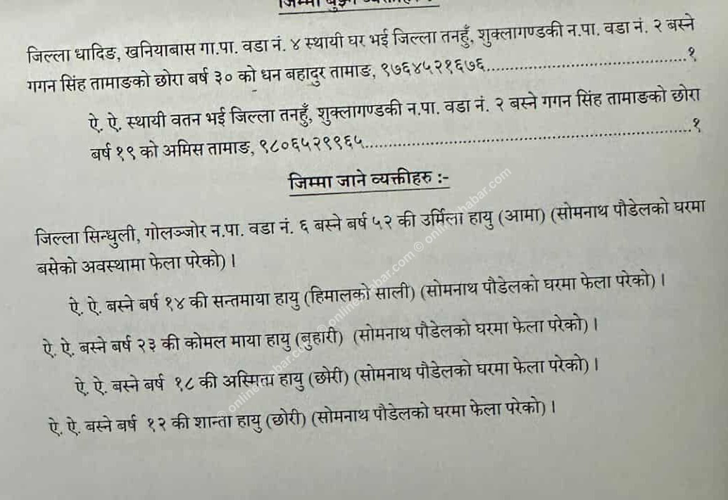 सिन्धुलीको गोलन्जोर गाउँपालिका–६ छेत्पाबाट बेपत्ता भएर पोखरामा भेटिएका उर्मिला हायूका परिवारलाई प्रहरीले आफन्तको जिम्मा लगाएको छ । सोमबार राति पोखरा महानगरपालिका–३० स्थित गगनगौंडामा भेटिएका उनीहरुलाई प्रहरीले धनबहादुर र अमिस तामाङको जिम्मा लगाएको हो । वडाध्यक्ष दुर्गाप्रसाद सुवेदीलगायतको रोहबरमा उनीहरुलाई जिम्मा लगाइएको प्रहरीले जनाएको छ ।