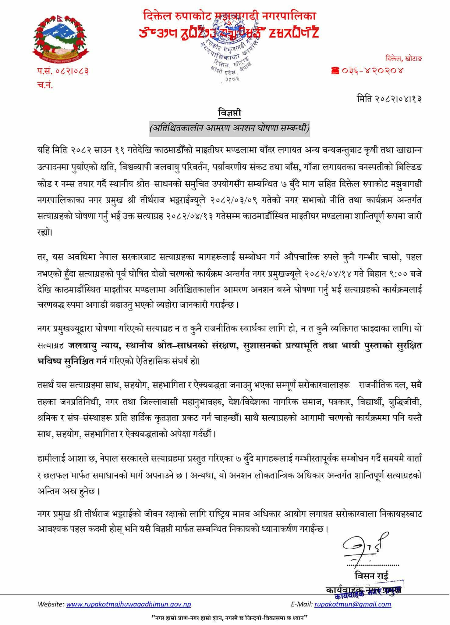 बाँदर लगायत अन्य वन्यजन्तुबाट खाद्यान्न उत्पादनमा पुगेको क्षति, विश्वव्यापी जलवायु परिवर्तन, पर्यावरणीय सङ्कट तथा बाँस र गाँजा लगायतका वनस्पतिको बिल्डिङ कोड र नम्स तयार गर्दै स्थानीय स्रोत साधनको समुचित उपयोगसँग सम्बन्धित सात बुँदै माग सहित मेयर भट्टराईले असार ९ गते बसेको नगर सभाको नीति तथा कार्यक्रमबाट सत्याग्रह घोषणा गरेका थिए । उल्लेखित माग राख्दै मेयर भट्टराईले साउन १३ (सम्म) काठमाडौँको माइतीघरमा शान्तिपूर्ण सत्याग्रह बसेका थिए । तर, सरकारले सत्याग्रहका माग सम्बोधन गर्न औपचारिक रूपमा कुनै चासो र पहल नगरेकाले अनिश्चितकालीन आमरण अनसन घोषणा गरेका पालिकाका कार्यवाहक नगरप्रमुख विसन राईले जानकारी दिएका छन् ।