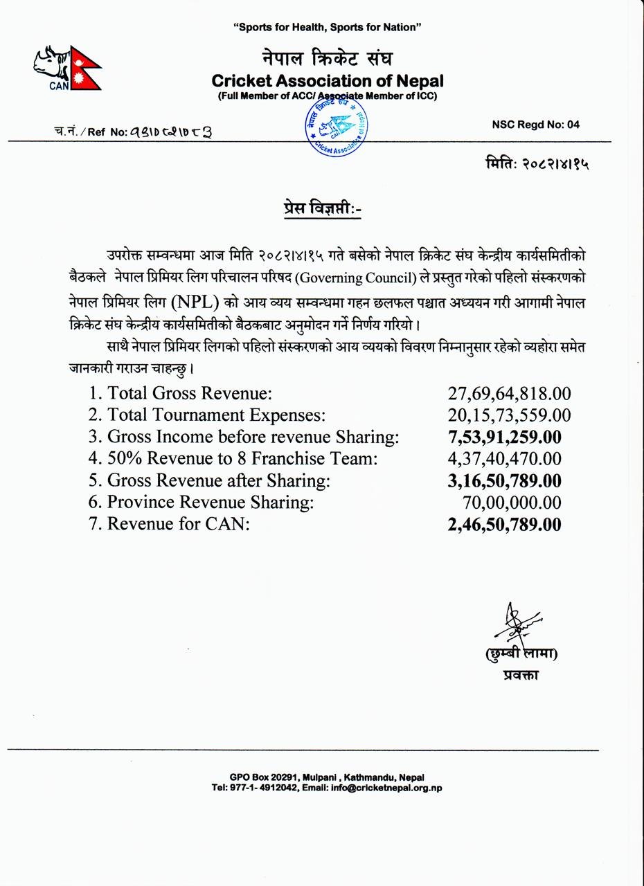 क्यानले जारी गरेको प्रेस विज्ञप्तिअनुसार एनपीएलको कुल आम्दानी २७ करोड ६९ लाख ६४ हजार ८१८ रुपैयाँ रहेको छ। कुल खर्च भने २० करोड १५ लाख ७३ हजार ५५९ रुपैयाँ पुगेको छ। त्यसअनुसार एनपीएलको राजस्व बाँडफाँडअघि कुल नाफा ७ करोड ५३ लाख ९१ हजार २५९ रुपैयाँ रहेको थियो।