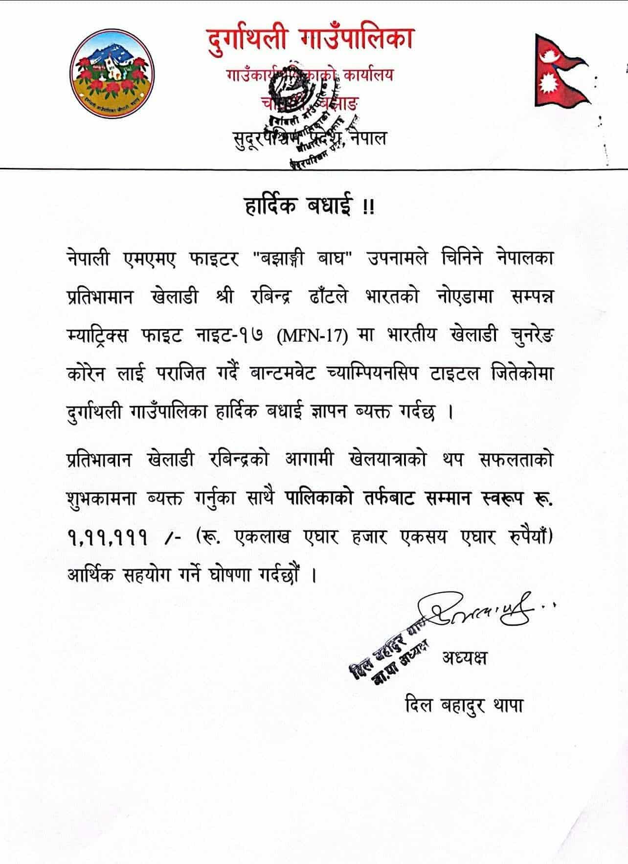 म्याट्रिक्स फाइट नाइट (एमएफए १७) मा बान्टमवेट च्याम्पियन जितेका रवीन्द्र ढाँटलाई बझाङको दुर्गाथली गाउँपालिकाले सम्मानस्वरूप एक लाख ११ हजार रुपैयाँ आर्थिक सहयोग घोषणा गरेको छ ।