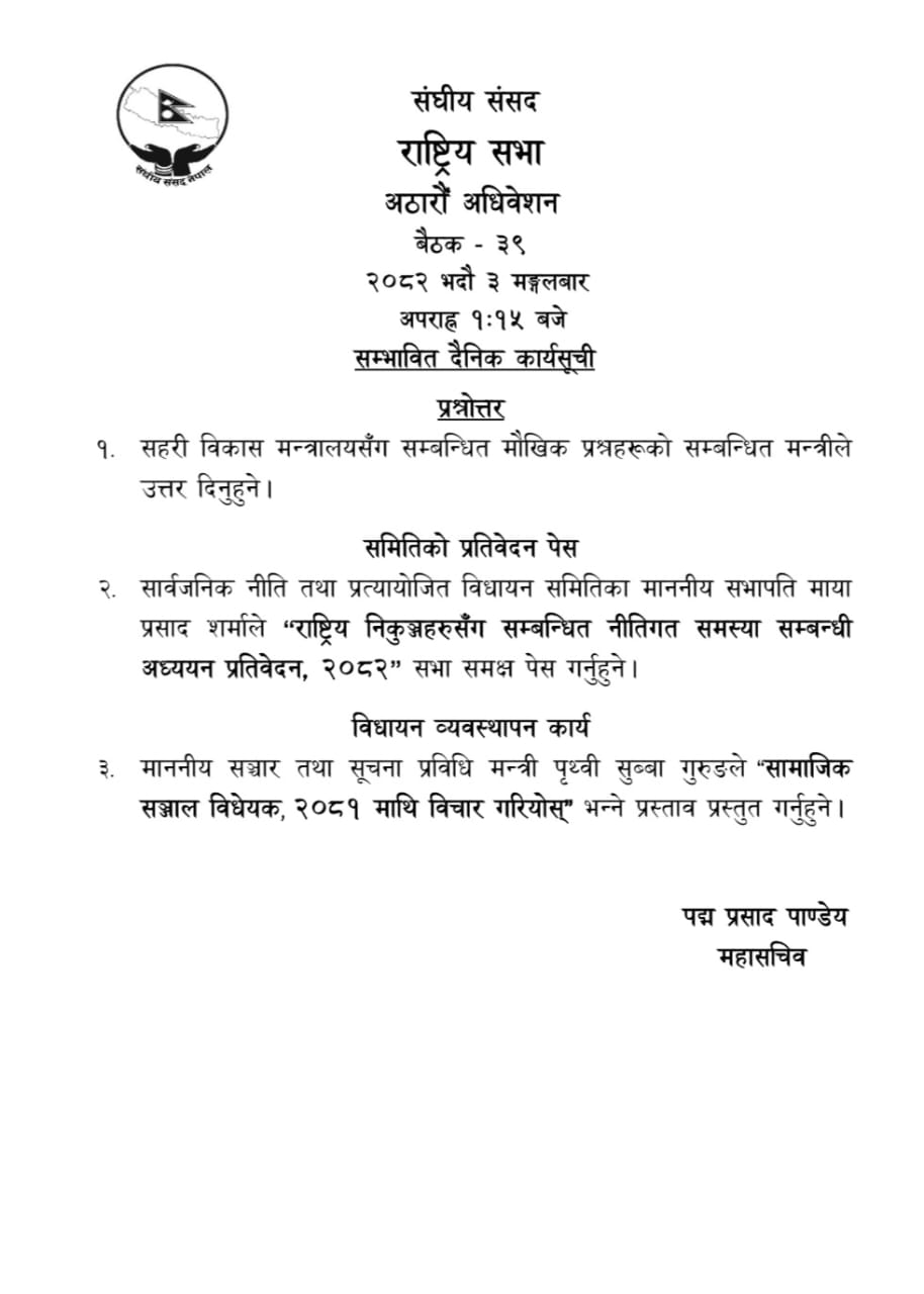 यसैगरी, सञ्चार तथा सूचना प्रविधि मन्त्री पृथ्वीसुब्बा गुरुङले ‘सामाजिक सञ्जाल विधेयक, २०८१ माथि विचार गरियोस्’ भन्ने प्रस्ताव प्रस्तुत गर्ने छन् ।