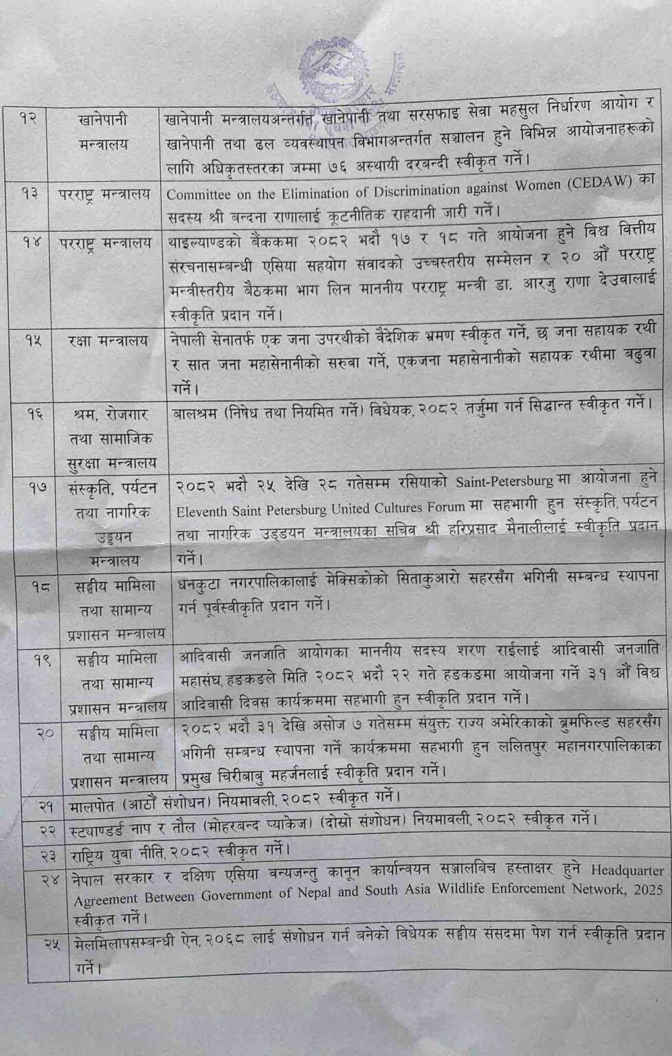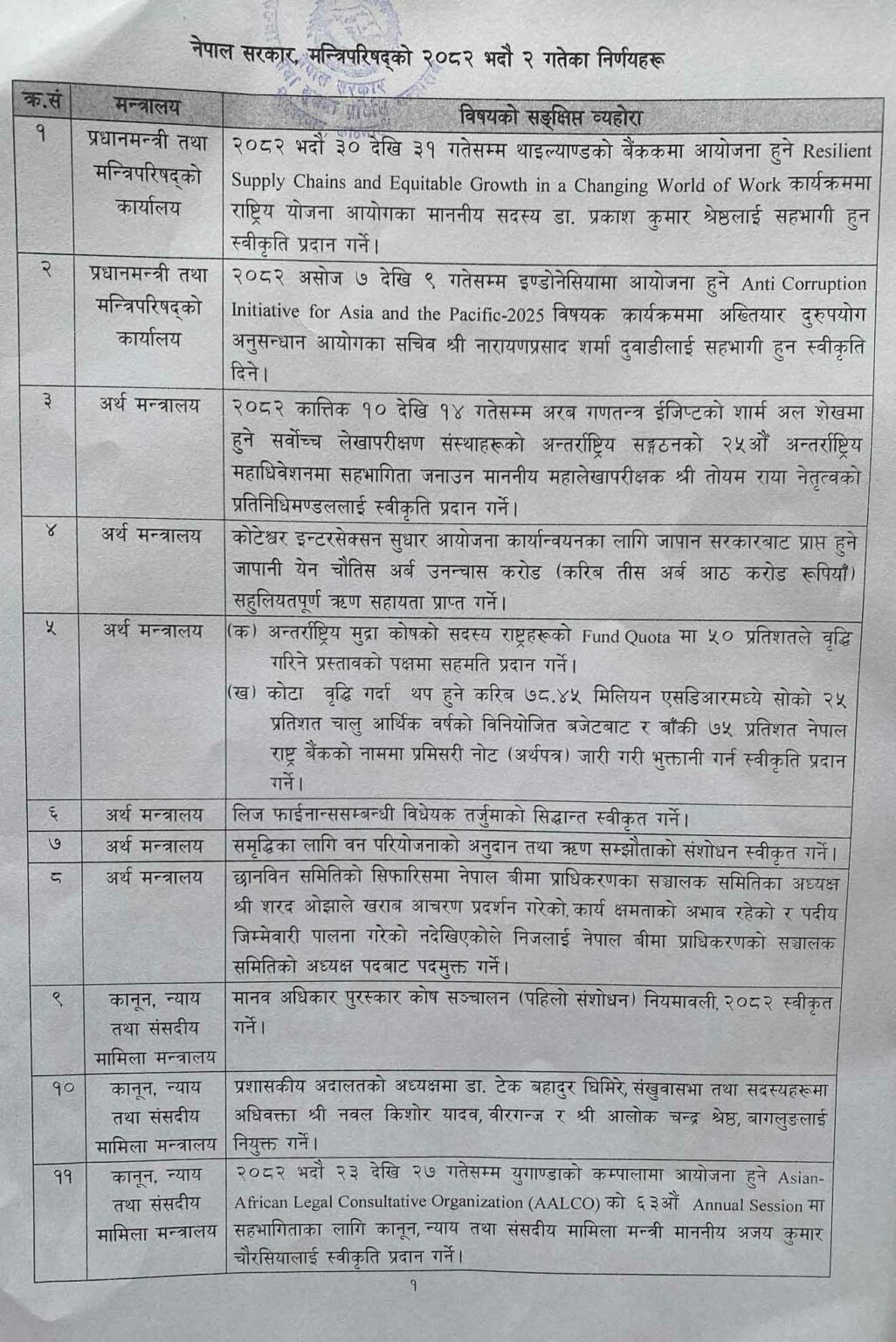 मन्त्रिपरिषद्‌ पछिल्लो बैठकको निर्णय :