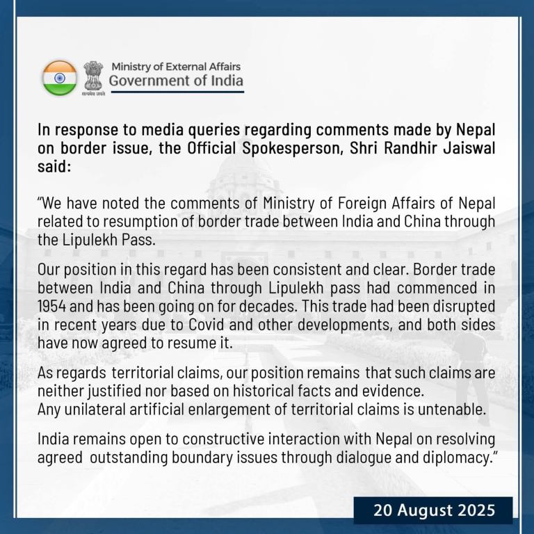 विदेश मन्त्रालयका प्रवक्ता रणधीर जैसवालले बुधबार एक विज्ञप्ति जारी गर्दै लिपुलेक व्यापार मार्गबारे भारतको अडान स्पष्ट र दीर्घकालीन रहेको बताए।