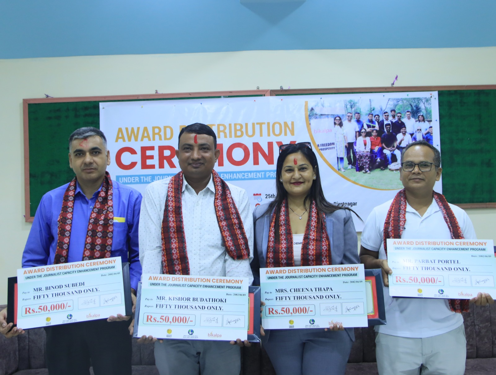 आज विराटनगर सम्पन्न फेलोसिप हस्तान्तरण कार्यक्रममा विकल्पले जनही ५० हजारको फेलोसिप ४ जना पत्रकारलाई हस्तान्तरण गरेको हो ।