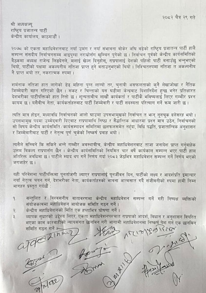 काठमाडौंराष्ट्रिय प्रजातन्त्र पार्टी (राप्रपा) भित्र नेतृत्वको विषयमा विवाद तीव्र बनेको छ। प्रतिनिधि सभा निर्वाचनमा भोगिएको हारको समीक्षा नगरेको आरोप लगाउँदै पार्टीका महामन्त्रीसहित ११ नेताले अध्यक्ष राजेन्द्र लिङ्देन सँग विकल्प खोज्न र महाधिवेशन आह्वान गर्न माग गरेका छन्।