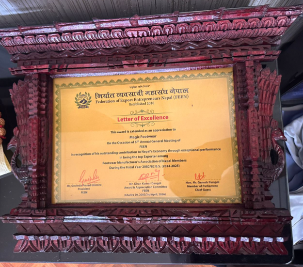 आर्थिक वर्ष २०८१/८२ मा एक सय ४८ करोड रुपैयाँ बराबरको जुत्ता निर्यात गर्दै देशकै नम्बर एक फुटवेयर निर्यातकको सम्मान आर्जन गरेको हो । निर्यात व्यवसायी महासंघ नेपाल (फिन) को छैंटौं वार्षिक साधारण सभाको अवसर पारेर केही दिनअगाडि काठमाडौंको लाजिम्पाटस्थित होटल दूषित प्रिन्सेसमा एक विशेष समारोहबीच म्याजिक फुटवेयर सम्मानित भएको हो ।