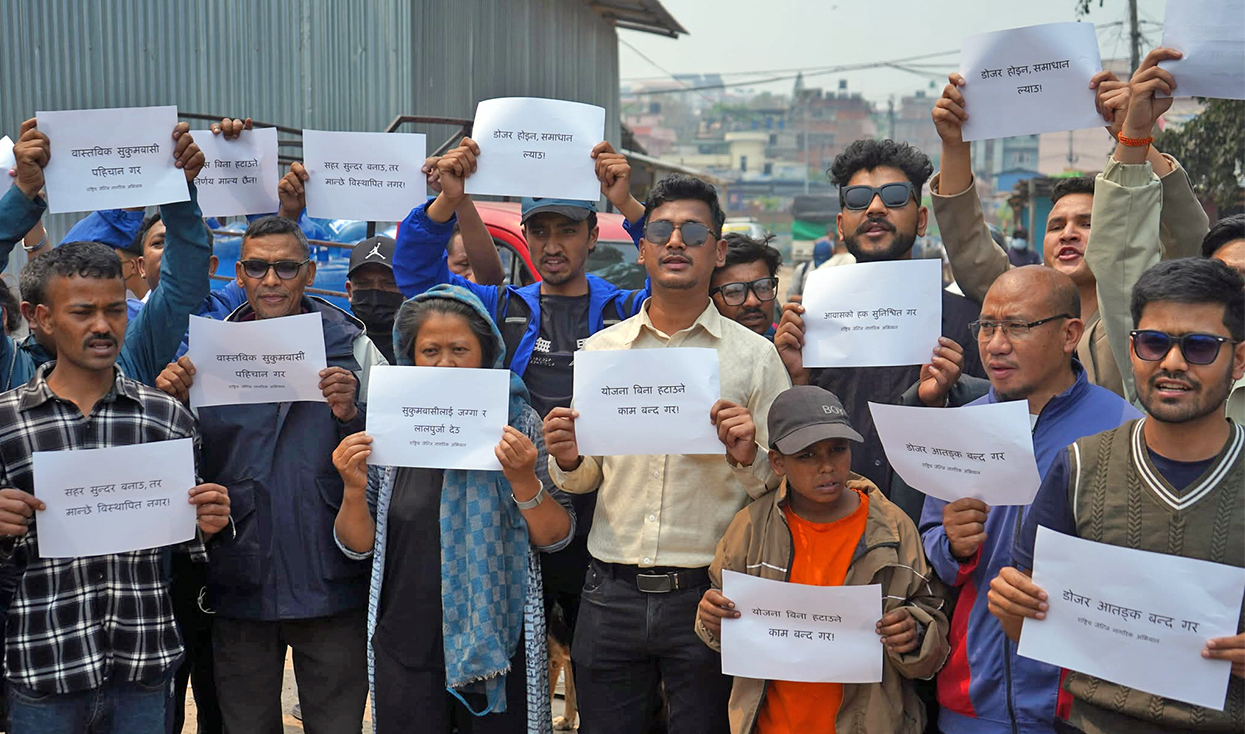 काठमाडौं – सुकुमवासी बस्ती खाली गराउने सरकारको निर्णयविरुद्ध थापाथली क्षेत्रमा प्रदर्शन भइरहेको छ।स्थानीयहरूले नेपाल सरकार विरुद्ध नाराबाजी गर्दै ‘डोजर आतंक बन्द गर’, ‘आवासको हक सुनिश्चित गर’ जस्ता नारा लगाइरहेका छन्।